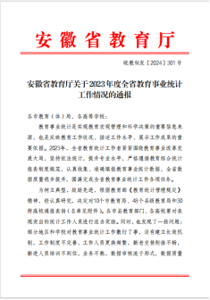 近日,安徽省教育厅对2023年度全省教育事业统计工作情况进行了通报,共通报表彰了58个市、县级教育局,12所本科院校、18所高职高专院校,金沙威尼斯官网作为被表彰的“优秀单位”名列其中。
