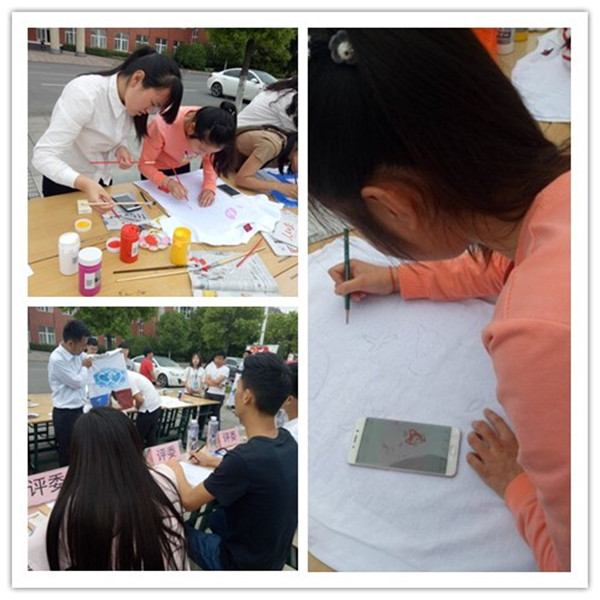 活动伊始,主持人在台上宣布了比赛的规则后,参加活动的同学们立刻挥动着手中的画笔,在他们辛勤的笔下,描绘出了一件件精美的T恤。在活动最后,主持人宣布了本次获奖比赛的名单,我系范园园同学获得了一等奖,贾雪冰同学取得了二等奖。