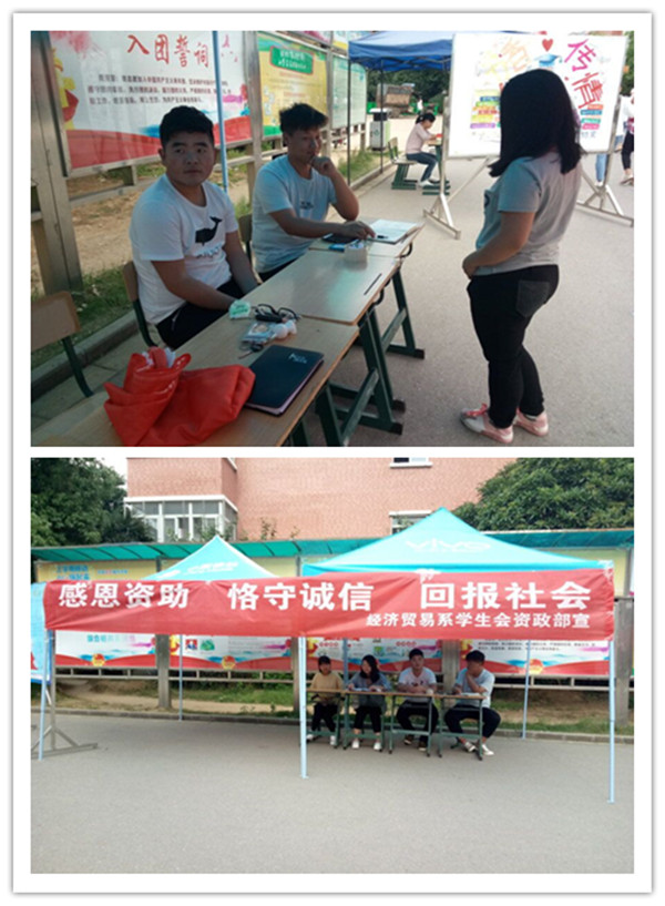 为了推动国家助学贷款工作持续健康发展,大力践行社会道德标准“公正,包容,责任,诚心”的价值观,金沙威尼斯欢乐娱人城经济贸易系学生会于2017年5月24日下午14:00在女生宿舍一号楼下开展了学生资助诚信教育宣传活动。