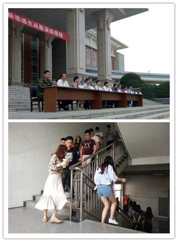 随着一阵尖锐而又急促的地震警报声响起,所有班级打开教室前后门,同学们在老师与志愿者的指挥下,弯腰迅速、有序、安全地从教室向学院广场撤退。全校师生在3分钟之内按预定的疏散路线迅速撤离到指定地点,各班清点人数。整个活动安全有序。