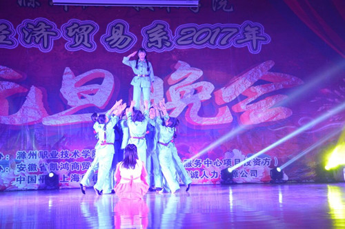 2016年12月27日晚,经济贸易系2017年元旦晚会在大礼堂圆满落幕。学院院党委委员、副院长吴大明、安徽省凯鸿商贸有限公司赵松青总经理、经贸系主任翁嘉晨、系党总支书记李有志、院团委书记王蓓蓓,实训中心副主任刘杰、经济贸易系副主任宋君远以及经济贸易系的老师们与经贸学子一起喜迎新春,相约2017。