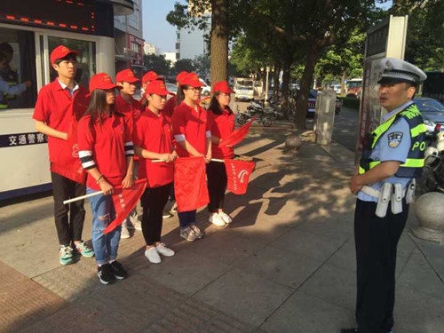 活动过程中,同学们选定交通指挥的地点,提前和交警负责人沟通好,并且在银花西区街道为行人宣传交通知识,传播文明交通,并帮助孕妇、老人等行动不便者过马路,以减少交通事故的发生。