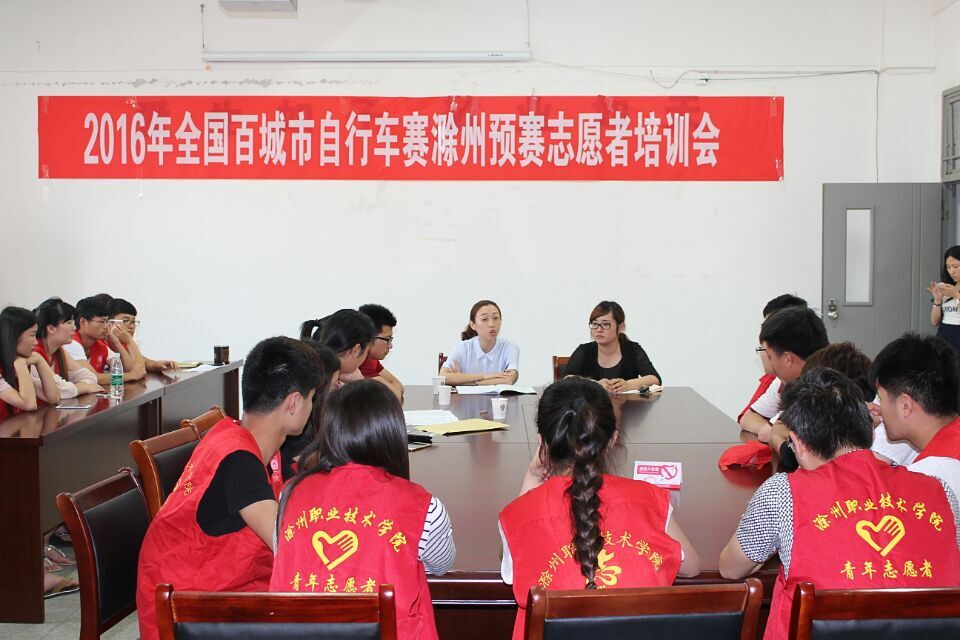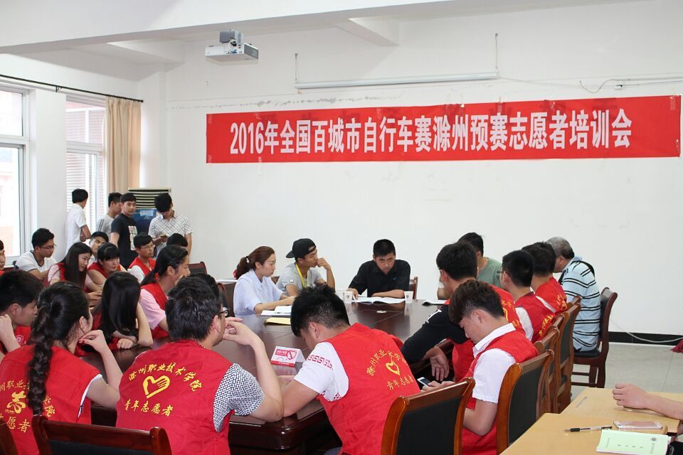 2016年6月16日晚上7点,2016年全国百城市自行车赛滁州预赛志愿者培训会在5513教室举行。本次会议有南谯区团委副书记戴鹰、我系团总支书记朱婷婷以及51名志愿者参加。培训会由大赛负责人对汽车工程系志愿者进行专业知识、礼仪等知识进行培训。