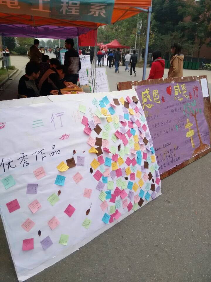 2014年11月11号,机电系举行的“三行情书”温暖活动在女生宿舍1号楼下圆满结束。这次活动是以亲情、友情、爱情为背景,用三句话的形式写出了你的爱。