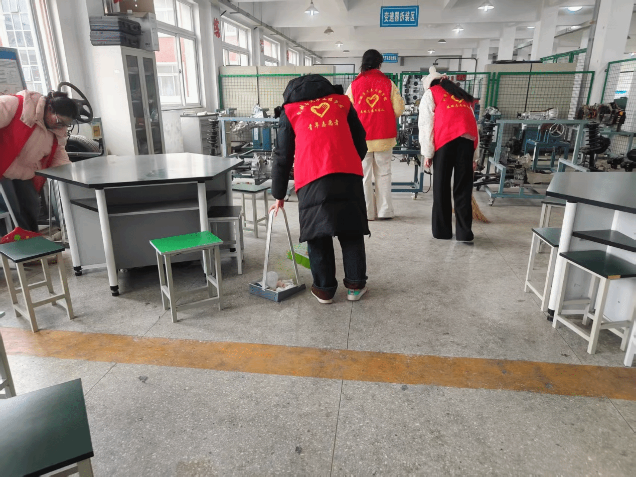 汽车实训室,作为同学们日常汽车实训的主阵地,摆满了汽车模型、发动机、精密检测工具等设备。因长期频繁使用,地面油污与灰尘、零件残渣相互交织,黑乎乎一片。同学们分工明确,各司其职。擦拭小组专注认真,手持抹布,仔细擦拭汽车零部件。清扫小组干劲十足,挥舞扫帚,将灰尘、碎屑聚拢。整理小组忙着“归位”,按用途、型号归类摆放工具,为后续实训教学做好后勤保障。