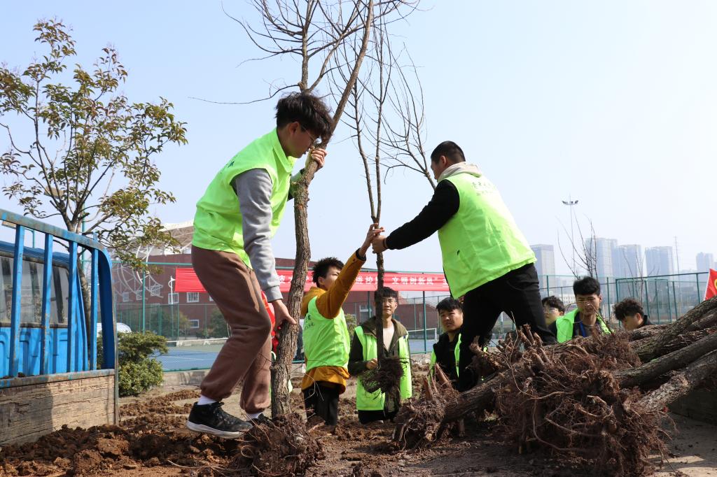 启动仪式结束后,“小青亭”志愿者及各系部按照划分位置展开植树活动。他们扶直树苗、挥锹铲土、培实新土、浇水,每道工序都做得一丝不苟,大家干劲十足,动作熟练,配合默契。大家齐心协力,通力合作,用汗水浇注了新的希望。