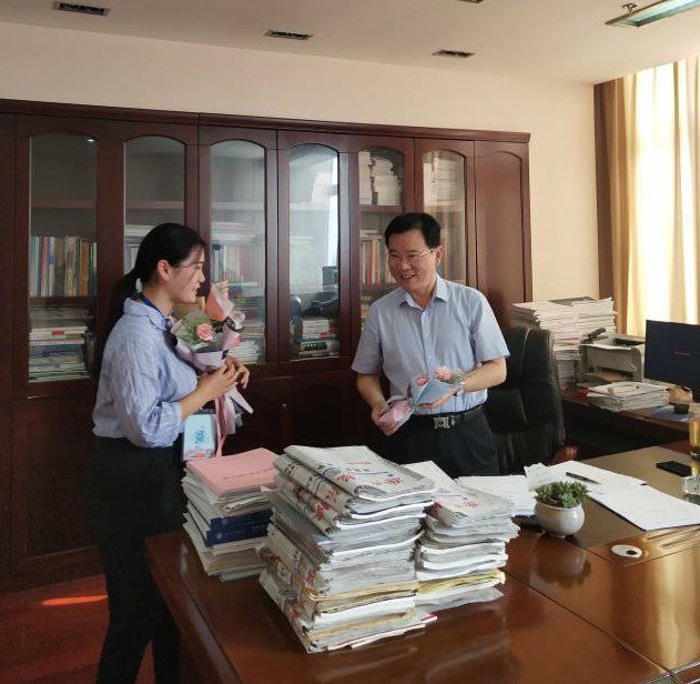 节日当天,同学们带着笑容早早来到老师们的办公室,亲手为老师们送上康乃馨和节日的问候,只为在这感恩的教师节里为敬爱的老师献上真诚的祝福:“老师,您辛苦了!”。此外,同学们还绘制了指纹树,老师们一个接着一个的指纹填满树枝,形成了坚实的树冠,表达了同学们对老师浓浓的谢意。一句句简单问候,把老师的幸福感装得满满的。