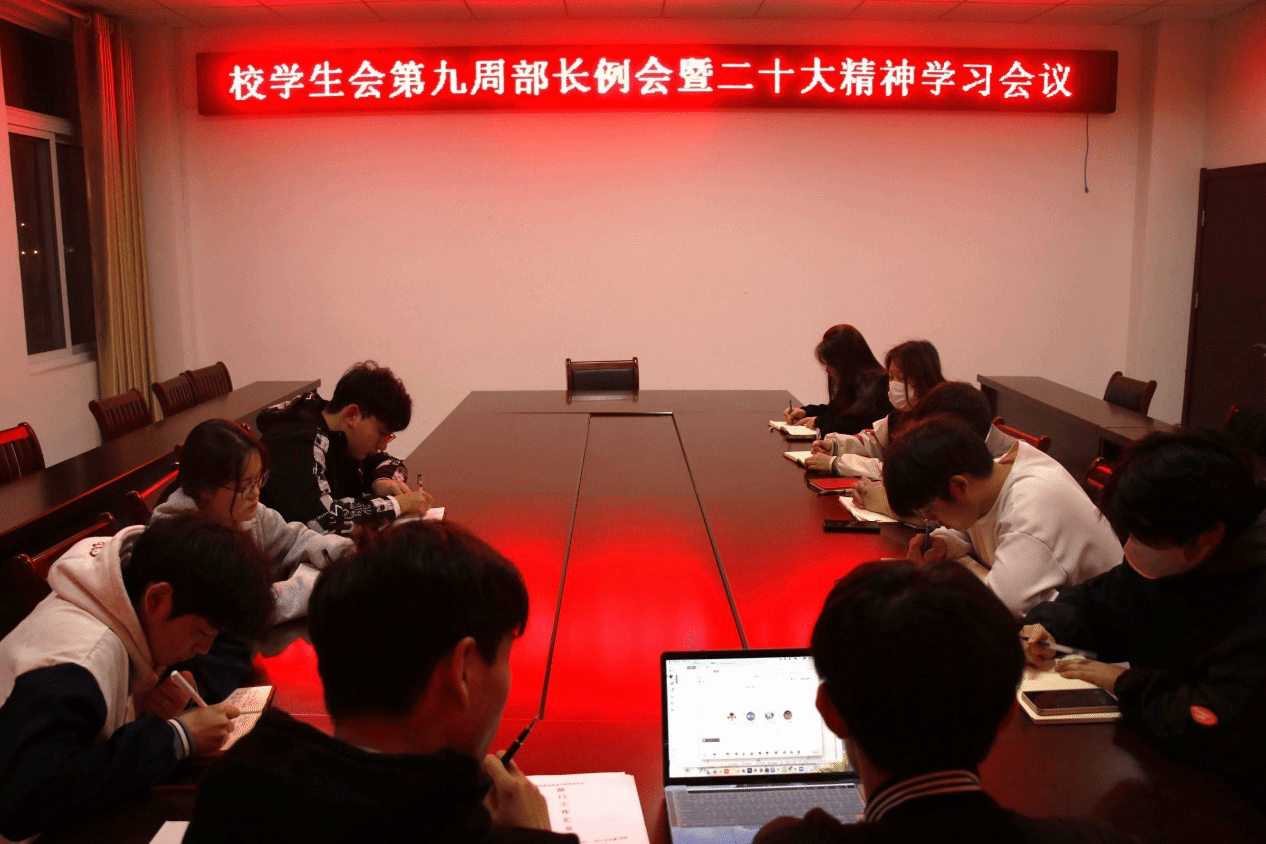 2023年4月3日,校学生会在大学生活动中心317召开了第九周部长例会暨党的二十大精神学习会议,会议由主席团成员、全体部门负责人参加。