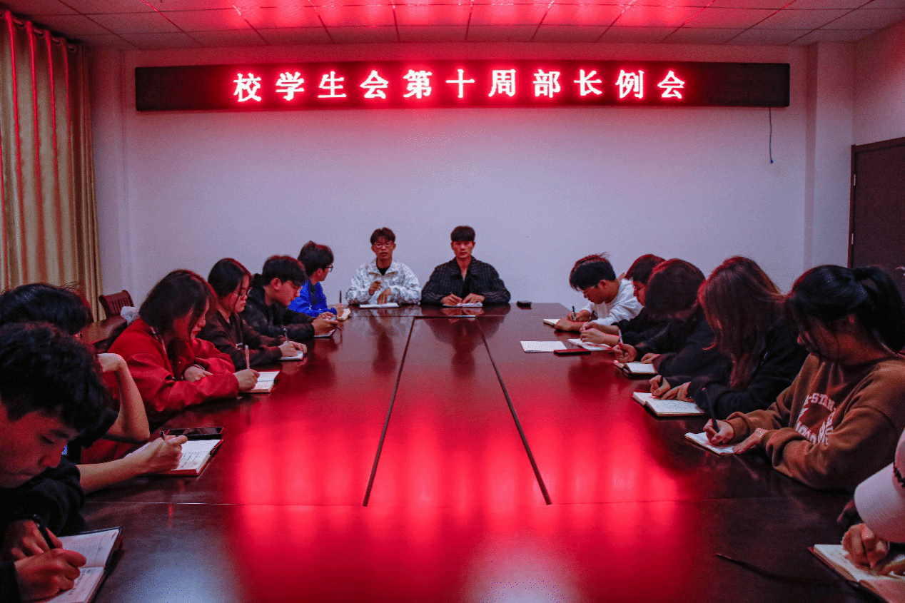 本次会议以校学生会内部培训为主,主席团向各个部门负责人讲述了对于内部成员培训的重要以及必要性,要求每个部门都要认真对待。其次主席团成员依次布置了“读书月”、“电影放映”、“我为同学办实事”等活动。