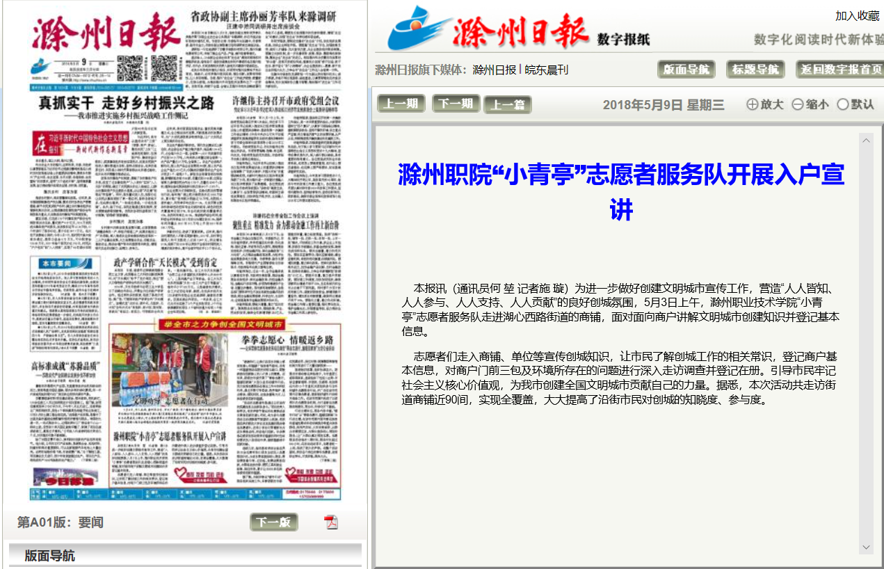 志愿服务是现代社会文明进步的重要标志,也是推动社会治理创新、完善社会服务体系的重要途径。在《滁州日报》刚刚发行的2018年5月9日A01版要闻报纸上,我院“小青亭”志愿者入户宣讲活动荣登《滁州日报》。