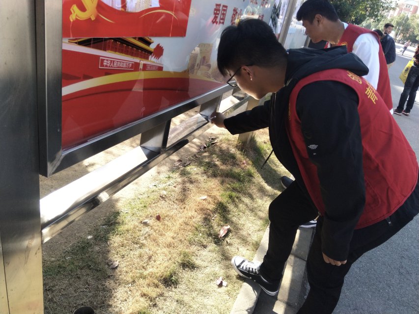 在进行简单的任务分配后,志愿者们对展板进行了彻底清理,拿着毛巾、脸盆为学院宣传栏、公示栏和展板除去灰尘,打扫中的志愿者们成为了一道亮丽的风景线。所有人都积极参与,将展板擦的一尘不染,小小的缝隙也被清理得干干净净。同学们用自己的实际行动为学校增添一份请新,一抹明亮。志愿者们经过近两个小时的劳动,学院的宣传栏、公示栏以及展板的面貌都焕然一新。