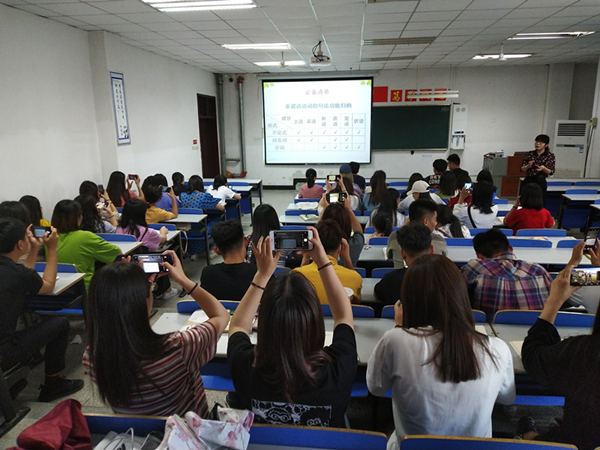 齐老师在对英语方面有独特的造诣,本次讲座的重点是英语中非常重要的语法“非谓语动词”,着重讲解了非谓语动词的三种形式:分词、动名词、不定式。老师在课堂上进行了详细的讲解,也给同学们做练习巩固。在场的每一位同学都全神贯注的听着,老师和同学们积极的互动带动了整场讲座的气氛,最后在经久不息的掌声中结束了本次讲座。
