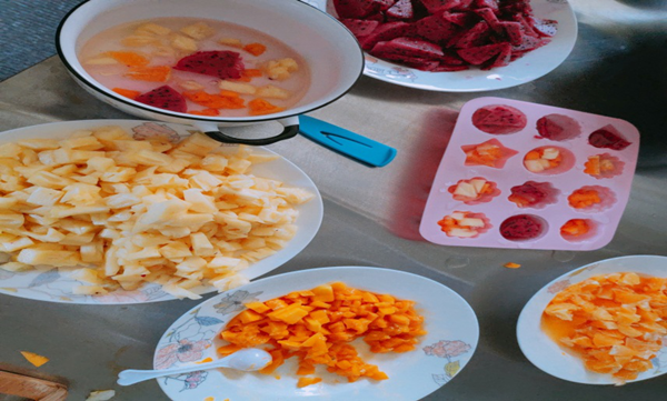 在指导老师的帮助下,社员们自己动手清洗材料。先把琼脂用凉水泡半小时,用500ML水加热搅拌,直到琼脂完全融化为止,紧接着倒入果汁,并将水果切成小块,放在小杯中。然后往小杯里倒入做好的琼脂水,放入冰箱冷藏至凝固。等冷藏过后大家取出,同学们一起品尝着自己动手的美味。在大家的欢声笑语中结束了此次活动。