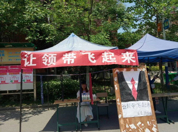 领带不仅能表达男性的品位和风度,还能成为男性无声的名片。领带是男性展示自己的窗口,更是男性个性的宣言。同学们在学校大小活动中都会使用到领带,并且以后面试和工作时也要佩戴领带。所以领带的正确佩戴对凸显仪表美是非常重要的。为此,商贸协会于5月17号中午在一号宿舍楼下举行“让领带飞起来”领带教学活动。
