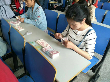 活动开始时,先进行的是点钞比赛,本次比赛分为两个轮回,第一轮是规定纸钞张数计算时间,比较同学们所用时间的长短。经过第一轮激烈的比拼后,最终留下6人进入第二轮的PK。第二轮是在规定的时间内比较每参赛选手谁数的又多又准。选手们手法不一的点着百元大钞,一指、两指、三指、四指争分夺秒,技艺手法让人看得眼花缭乱。一张张钞票如疾风般拂过他们的手指,现场气氛十分热烈。最终,16级电商3班方健、16级电商3班黄雅茜、16级会计7班徐媛分别荣获第一、二、三名奖,16级国贸班胡继美荣获优秀奖。