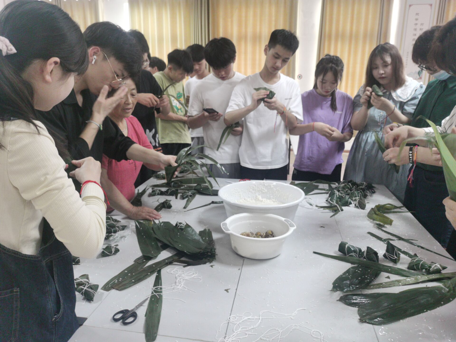 为弘扬和传承中国传统优秀文化,进一步促进活动更顺利的发展,本次活动社联全体人员都积极参加,在活动开始之前各部门负责人精心策划,提前准备好了包粽子的材料,进行活动场地申请以及与食堂负责人沟通包完粽子以后的加工过程,在校园内摆摊向全校师生赠送香包以及手带。同学们欢笑齐聚一堂包粽子,感受着端午节浓浓气氛,不仅以包粽子、送祝福的独特习俗形式来庆祝端午节,其中更寄托着同学们炽热的爱国之情。