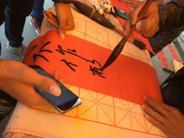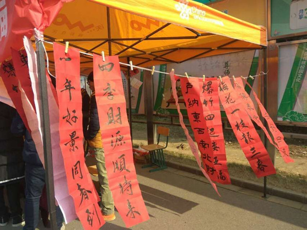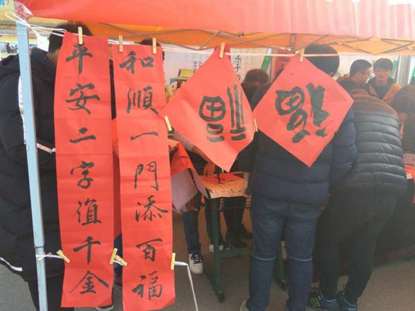 近日,书法协会的同学们利用自身优势,早上九点多金沙威尼斯官网书法协会的伙伴们在女生一号楼下设立摊点,活动刚开始不久就吸引了很多的同学来摊点领春联,内容自定,一元钱就能领一副,应同学的不同要求,分别用行书,隶书,楷书等多种书体书写春联,为即将到来的新春佳节,增添喜气,送上祝福。活动现场气氛火热,红幅铺展,挥毫泼墨,妙语成双,笔锋婉转处,浓飘香,前来领取的同学,络绎不绝。活动持续两天,第二日天公不作美,寒风怒怒,但风刀霜剑也抵挡不了同学们前来领春联的热情,一幅幅红彤彤的春联和一张张红彤彤的笑脸组成一幅喜庆的画。卖春联得来的钱不是规书法协会所有,而是作为公益活动捐给那些需要的人,虽然钱不多,但重要的是那份对公益炙热的心。大家其乐融融,为这个寒冷的冬天送来温暖。
