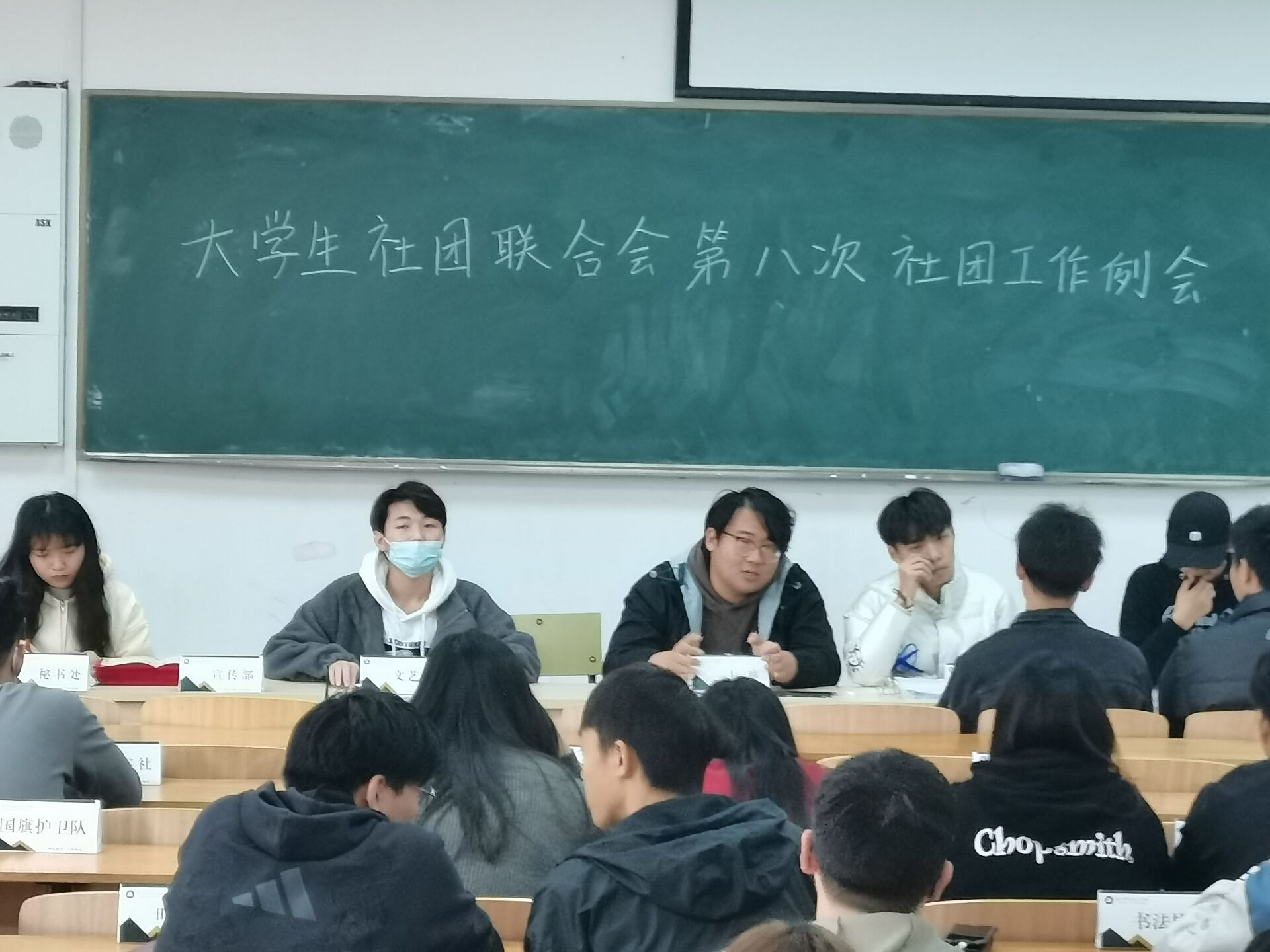 本次大会由社联主席辛永康主持,主要催促各社团尽快上报元旦晚会节目策划、社团文化节策划;强调不能私自拉赞助;强调各社团尽快完善内部建设,提高各社员的积极性等问题。