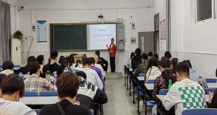 2022年4月25日下午16:00,数学爱好者协会指导老师杨颖颖在2113教室举办了“有限与无限的问题研究”的学术讲座。数学爱好者协会全体会员和全校对数学感兴趣的同学共同聆听了此次讲座。