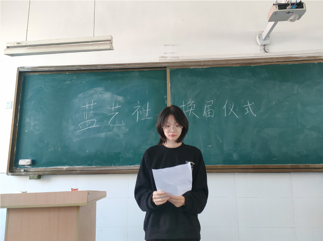 会议开始首先由蓝艺社社长介绍出席本次活动的人员,并宣布会议开始,随后各留任社员上台发言自己的换届稿,最后老师上台发言对于本社团以后工作的要求,并宣布会议结束
