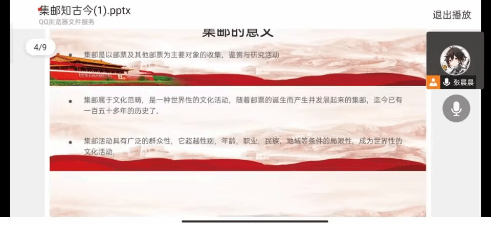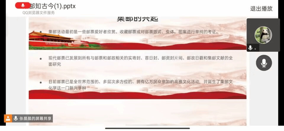 本次活动会长以线上PPT的形式讲解了集邮的兴起,集邮的魅力及其集邮的意义。讲述了邮票是弘扬一个国家或民族精粹的重要宣传载体,是一个国家政治、经济、历史、艺术和科学文化的缩影。在不同的历史时期,任何一个国家都是积极地把自己国家(或地区)最引以为傲、最先具有先进代表性的事务和信息展示在邮票上,让邮票随着邮件,抵达天南海北、四面八方。