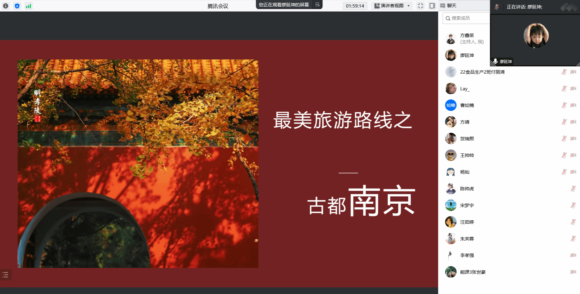 参赛选手充分的做好了活动的前期准备工作,以PPT的形式充分展示了自己心目中最美的旅游线路的分享,参赛选手分享选择本条最美旅游线路的原因。美在何处并且分享这条线路对自己而言的意义。线路的分享分别从春夏秋冬四季进行分享。充分展示了同学们对旅游的热爱。最后王帅帅同学、陶媛同学的分享获得了“最美旅游线路展示”一等奖。