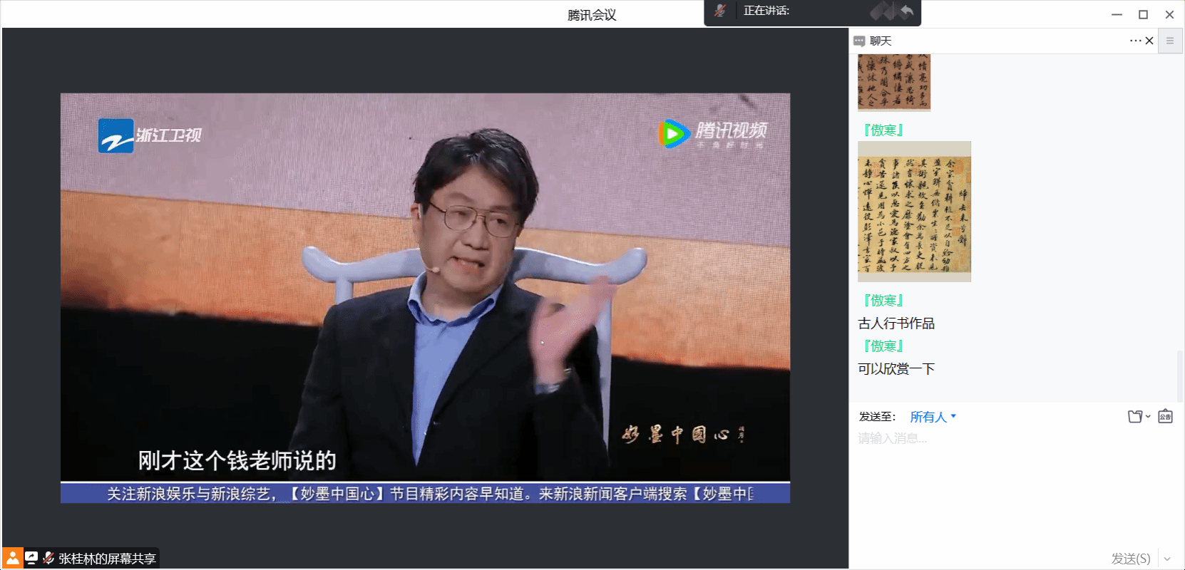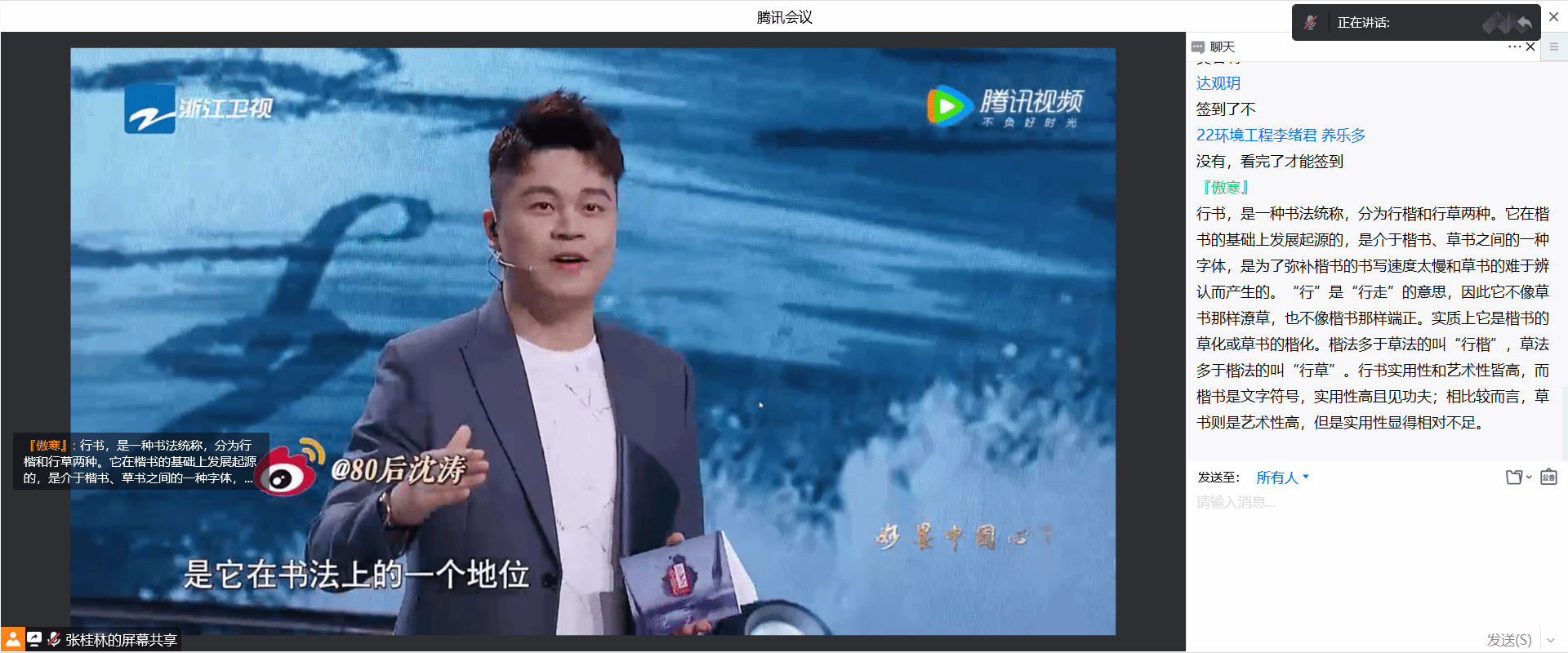 首先,同学们先下载腾讯会议。然后进入会议观看有关书法的纪录片。通过观看纪录片了解书法艺术是我国特有的文化艺术,并且历史悠久。