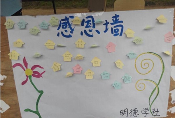 院明德学社为更好的呼吁大家大声说出心中的感恩之情,特地开展了“感恩五月”活动。本次活动分为两各部分进行。1、收藏同学们身边所见所闻的一些好的感恩性文段,让好文章常伴身边;2、录制关于感恩类型的视频,将一个个短视频整合成一个长视频,作为同学们一个美好的纪念。