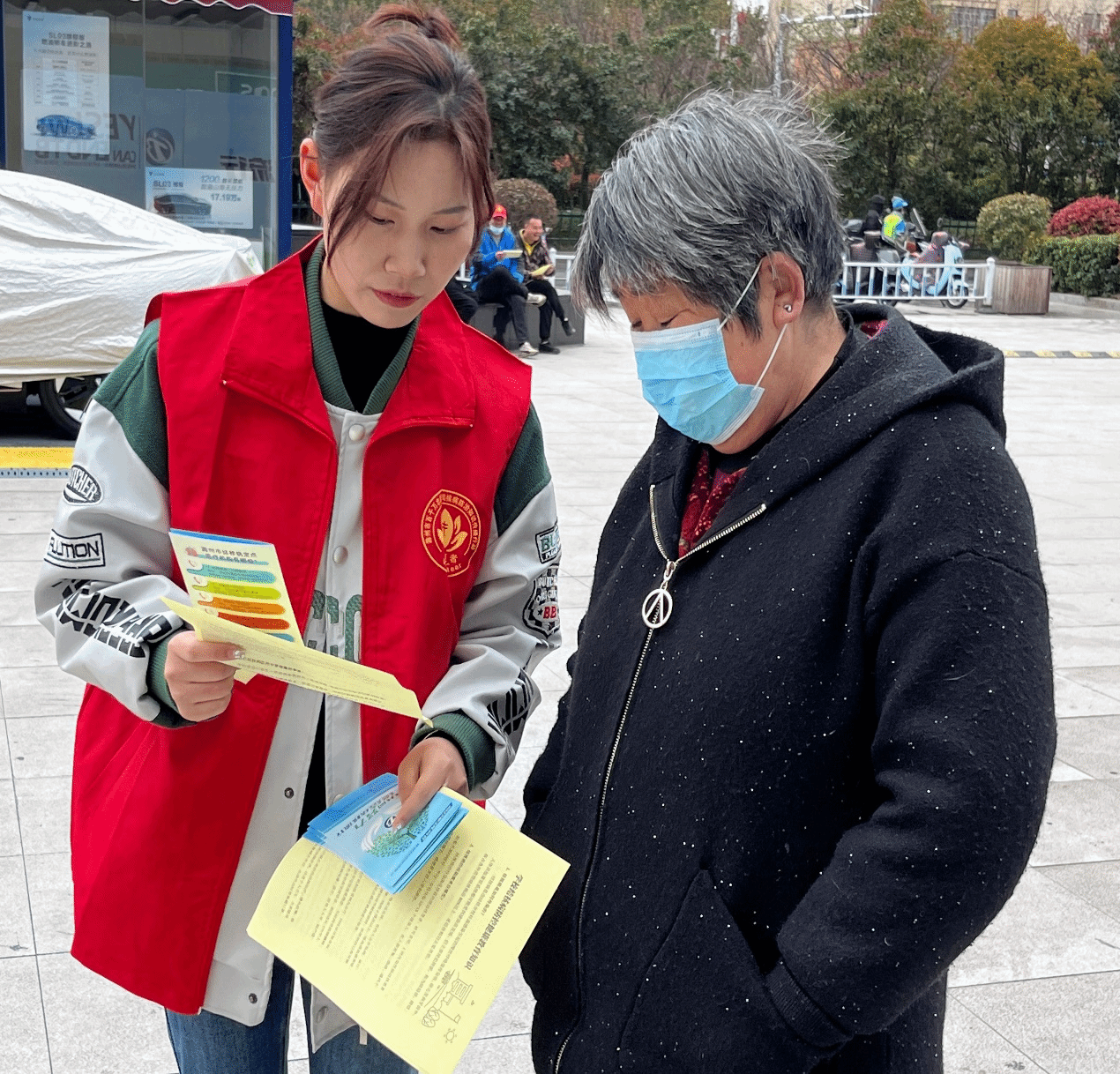 活动期间同学身着志愿者红马甲在人流量较大的玖玖广场分发预防肺结核宣传单。