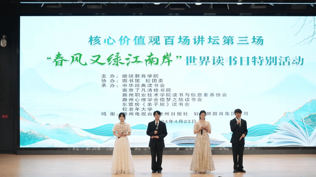 读书尚学,是中华民族的优良传统。为进一步弘扬社会主义核心价值观,培养更多的“向上向善”中华好青年,营造浓厚读书氛围,助推书香校园建设,贯彻落实“三全育人”理念,4月23日,在第29个世界读书日来临之际,金沙威尼斯官网读书与信息素养协会作为承办单位之一联合滁州城市职业技术学院中华经典读书会举办的“春风又绿江南岸”世界读书日特别活动。