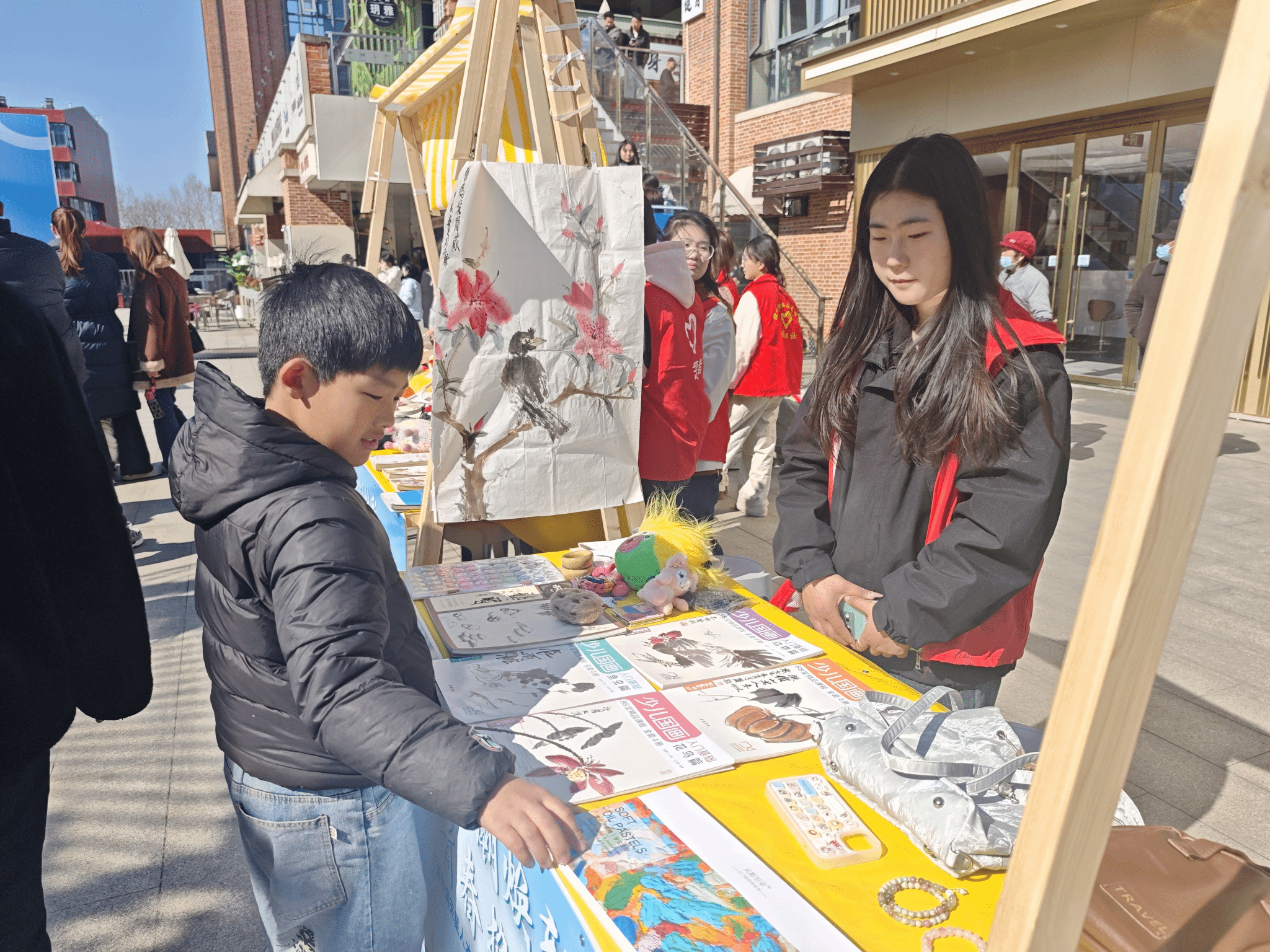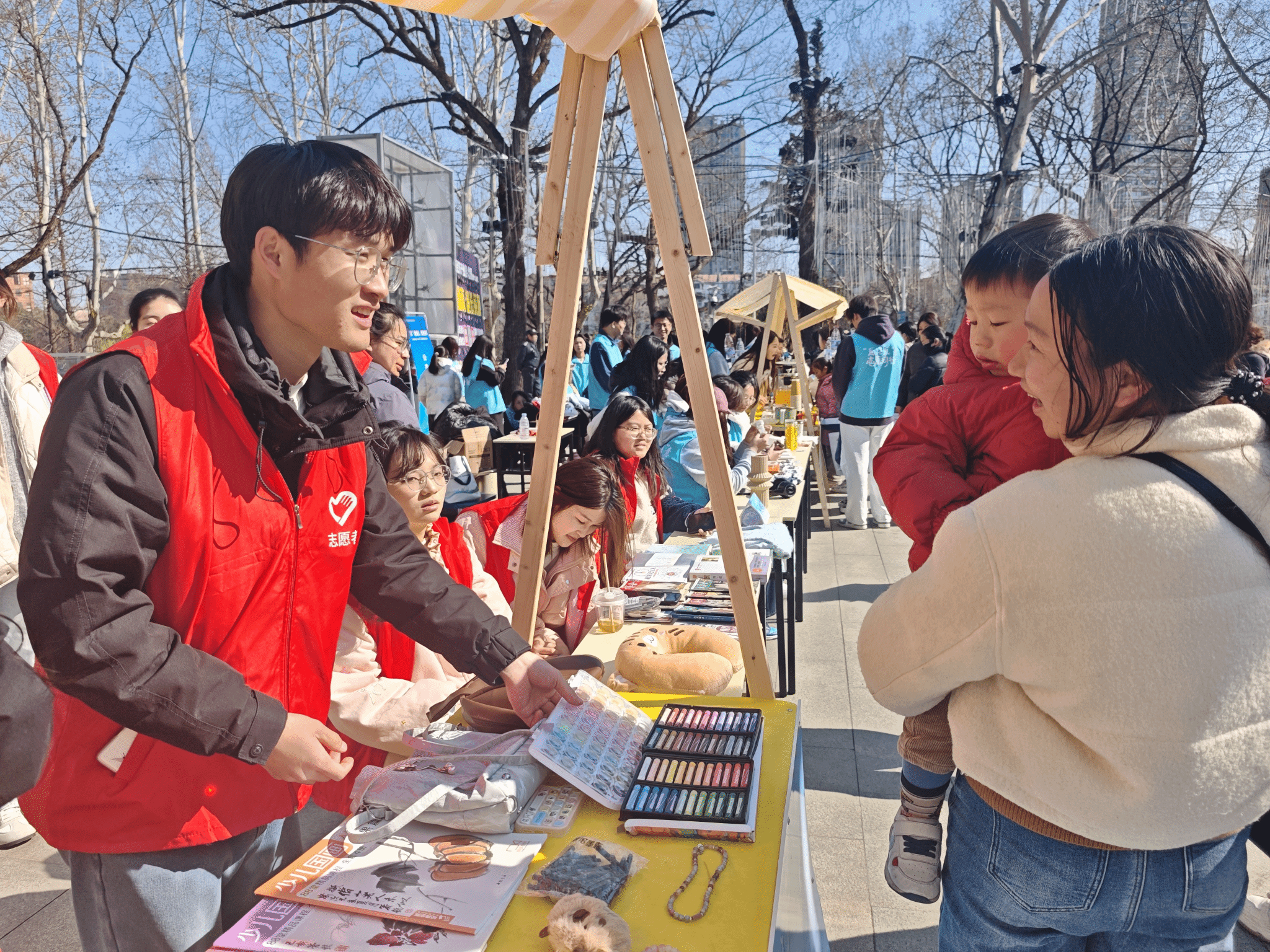 活动现场,摊位有序排列,各类义卖物品琳琅满目,大学生志愿者们热情地向过往行人介绍商品。每一笔交易,都承载着一份善意;市民们纷纷驻足,积极参与。
