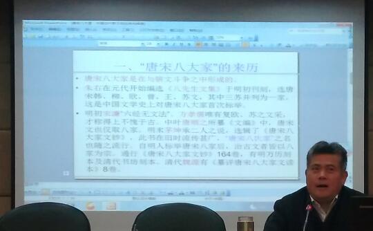 11月23日晚18:30,清峰文学社指导老师陈学军在综合楼11楼会议室开展“唐宋八大家—中国古代散文经典与辉煌”的文学主题讲座。