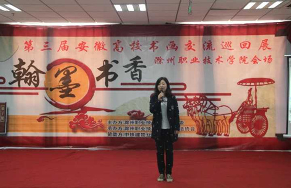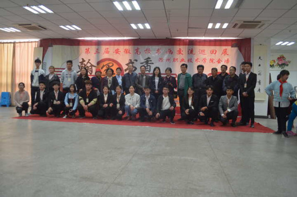 四月春风吹,十里花红柳绿,暖阳照,万物复苏,古文人墨客便趁此邀友踏青,吟诗作画。带着对传统文化的敬仰,带着对书画事业孜孜不倦地追求, 金沙威尼斯欢乐娱人城书法协会在4月11下午于我院综合楼207展厅举办了第三届安徽高校交流书画展,并邀请了滁州老年大学、安徽省各高校代表、解放小学的书画爱好者及金沙威尼斯欢乐娱人城各学生组织代表以及学院的同学们参加该次活动。本次活动还得到了中铁建物业公司合肥分公司的大力支持。