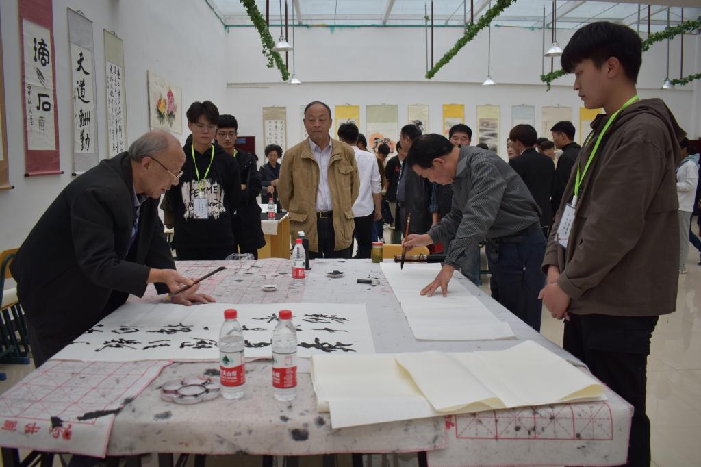 活动中,应邀而来的30余位书画专家泼墨挥毫、舞动丹青,共留下近60幅作品。他们现场进行书画展示,并向同学们讲解作品的意蕴、创作技巧。一幅幅书画作品,或灵动飘逸,或遒劲有力,或形神兼备,引得到场的师生啧啧称叹。先生们还为到场的学生慷慨题字,勉励大家珍惜青春少年时、勤学进取。