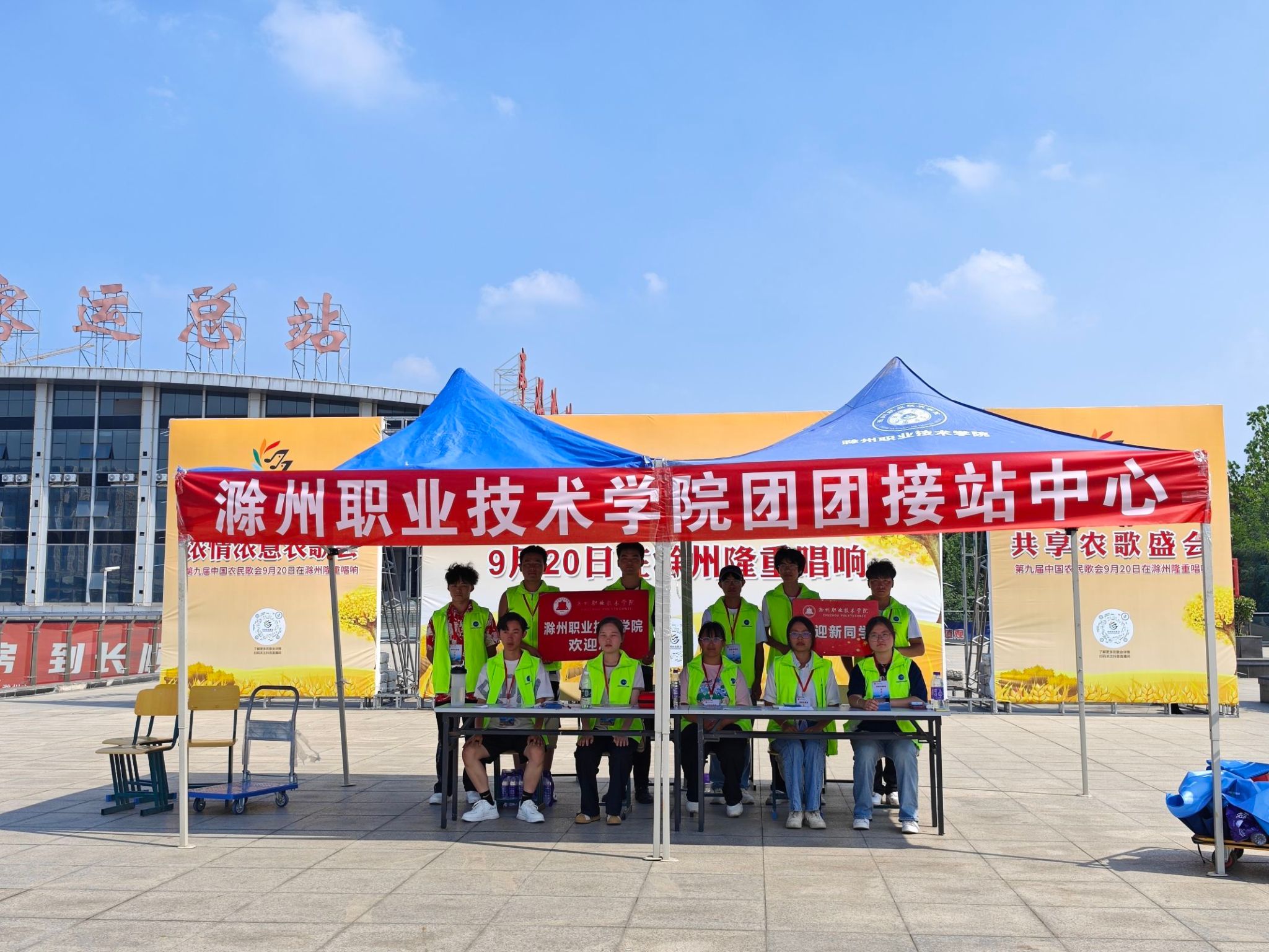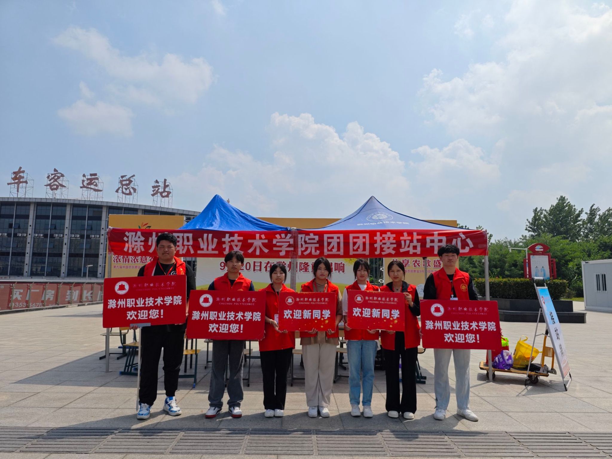 伴随着清晨的第一缕阳光,志愿者们已到岗就位,全天候、全过程、全方位,守护新同学,在学校门口、在滁州南站、在滁州北站,设有接待点,新生和家长一下车,众多的迎新志愿者马上微笑着迎上去:“你好”,“滁职欢迎您”。