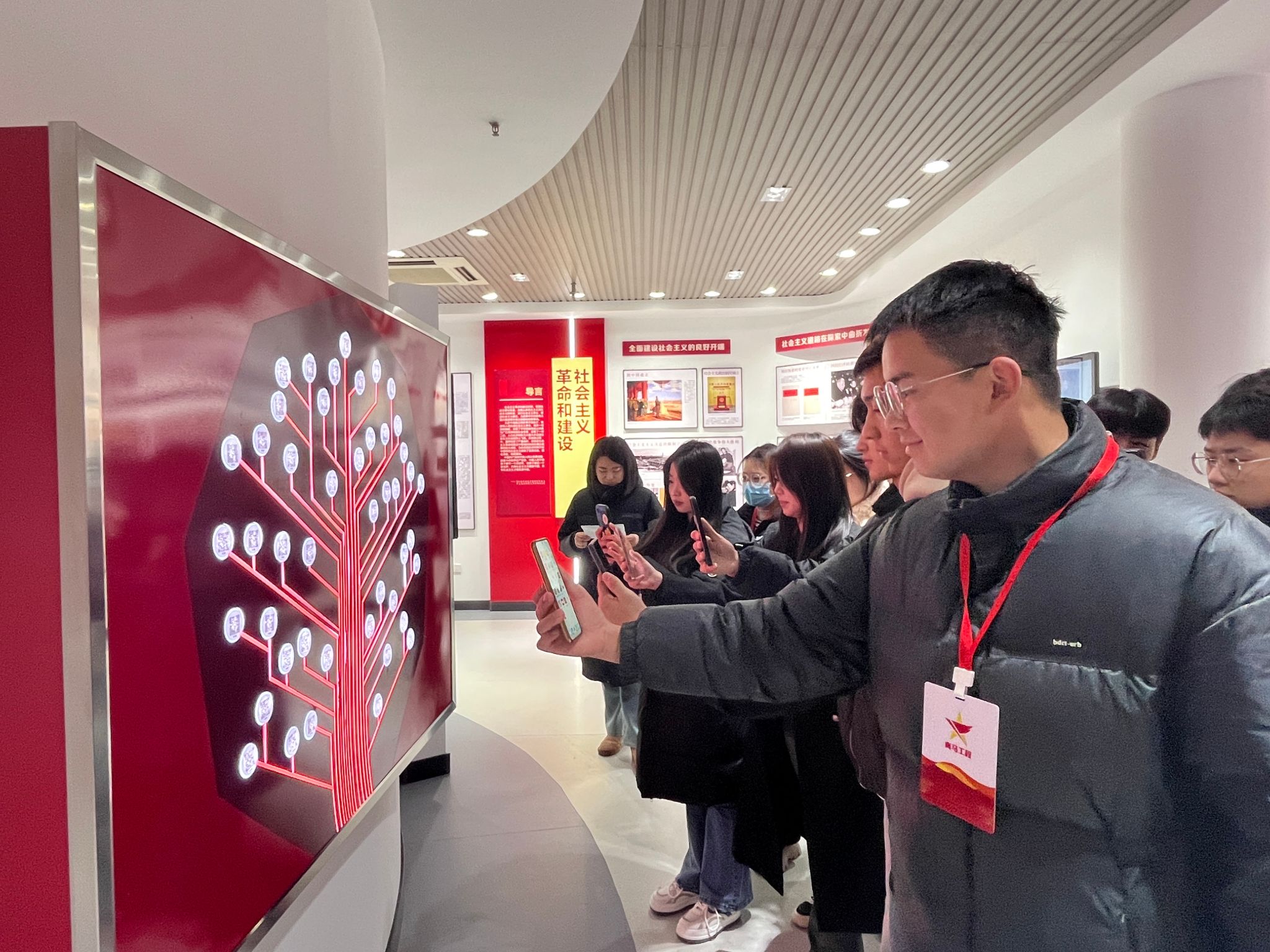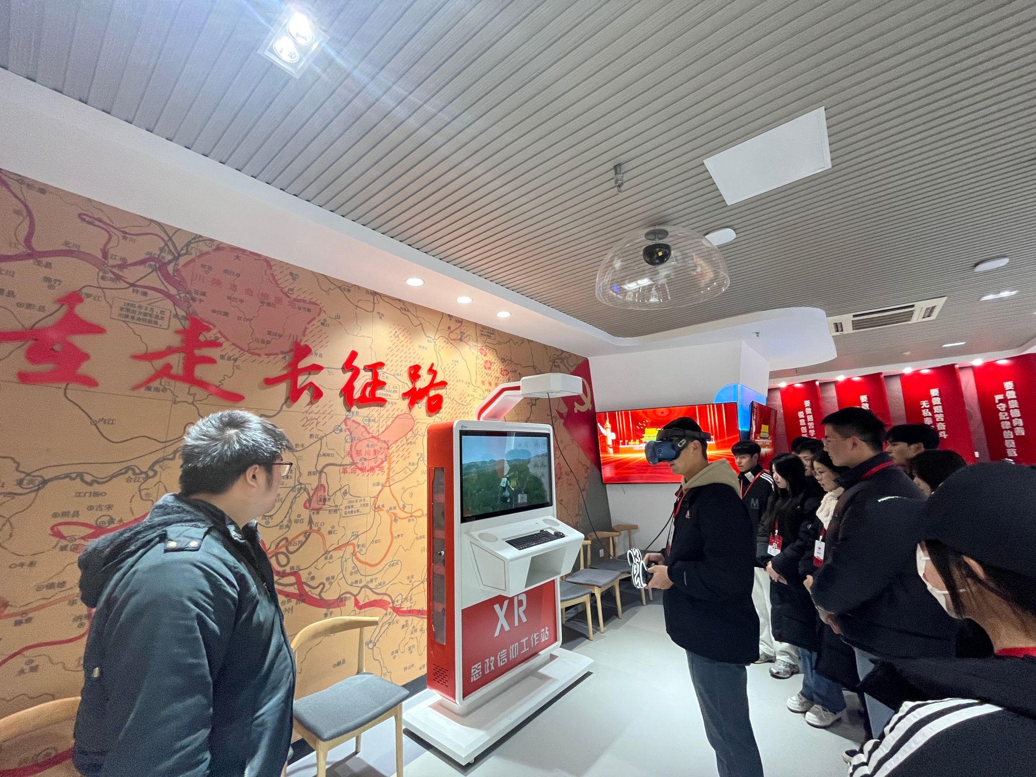 在VR互动教学体验区,学员们实现沉浸式、立体式的教学体验。重走长征路,立体呈现了爬雪山、过草地、飞夺泸定桥、湘江战役、强渡乌江等场景。在精神谱系墙周围,学员们纷纷拿出手机进行扫码,深入学习中国共产党人精神谱系的伟大精神。也了解了滁州本地资源,来安半塔保卫战、定远藕塘烈士纪念馆、天长抗大八分校、凤阳大包干纪念馆以及苏滁产业园的场景。