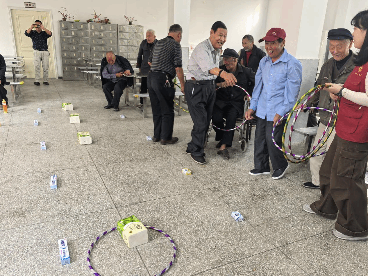 活动开始,志愿者们怀揣着满腔的关爱与温情,踏入了养老院。养老院的老人在工作人员的带领下,在食堂有序坐好,志愿者们纷纷热情的与老人们打招呼,活动在歌声中拉开了序幕。本次志愿服务活动主要包括以下三个环节:一是节目表演,包括吉他弹唱、笛子独奏以及女声合唱,老人们被志愿者的歌声所吸引;二是包饺子,众人一同围坐在餐桌边,热热闹闹地包饺子,一个个饺子整齐的摆放在盘子里面;三是套圈活动,地上摆放着纸巾、牙刷、牙膏、洗衣液、肥皂、洗发膏等物品,老人们人手一个圈,套着什么东西,就可以拿走,老人们蓄势待发,把活动推向了高潮。