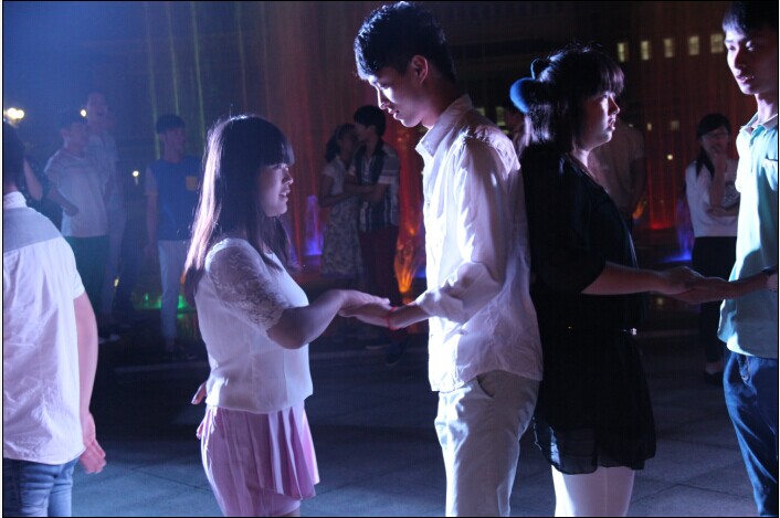 一对对舞步轻盈,多姿多彩,简单而不失美感,优美的音乐在喷泉广场上空飘荡,同学们携着各自的舞伴,踏着节拍,轻盈舞动,一片温馨和谐。优扬的音乐,动人的舞姿,组成一幅动人的图画,舞者们青春的面孔,更为这幅画作增添无限生机。