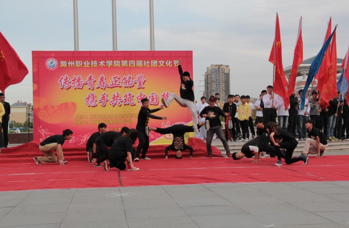 最后,院团委书记王蓓蓓宣布第四届社团文化节开幕!社团联合会的会旗传递仪式开始,来自星级社团的12名旗手在校园内传递社团联合会会旗,这也标志着社团文化节的正式开始,42个社团将积极行动起来,共同参与社团文化节的各项活动。仪式结束后,部分协会还给大家带来了精彩的社团节目汇演。舞龙舞狮协会表演了气势非凡的节目《龙腾盛世》,体现了当代大学生的热力青春。艺术团的《凤阳花鼓》充分体现了当地的民俗文化,精彩的街舞表演、健美操表演和武术表演都体现了我院青年学子的青春和活力。汇演临近结束前,户外运动协会表演了难度技巧较高的滑轮表演,令在场师生啧啧称叹。