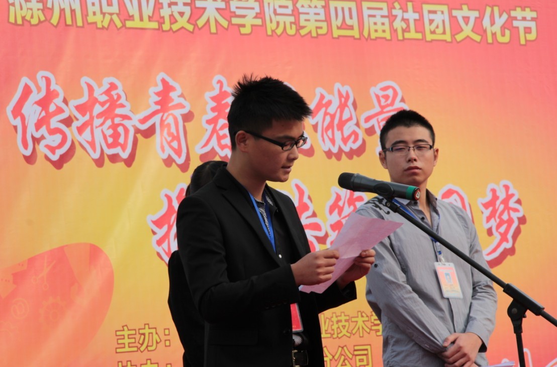 入场式结束后,社联主席席国栋同学发言,简要介绍了我院社团联在这一年度所取得的成绩和所存在的问题。社联副主席张程同学宣读了《关于举办金沙威尼斯欢乐娱人城第四届大学生社团文化节的通知》。广播站项磊同学宣读了《创建文明城市倡议书》,号召所有同学积极行动起来,从自身做起,积极参加滁州市六城联创工作。
