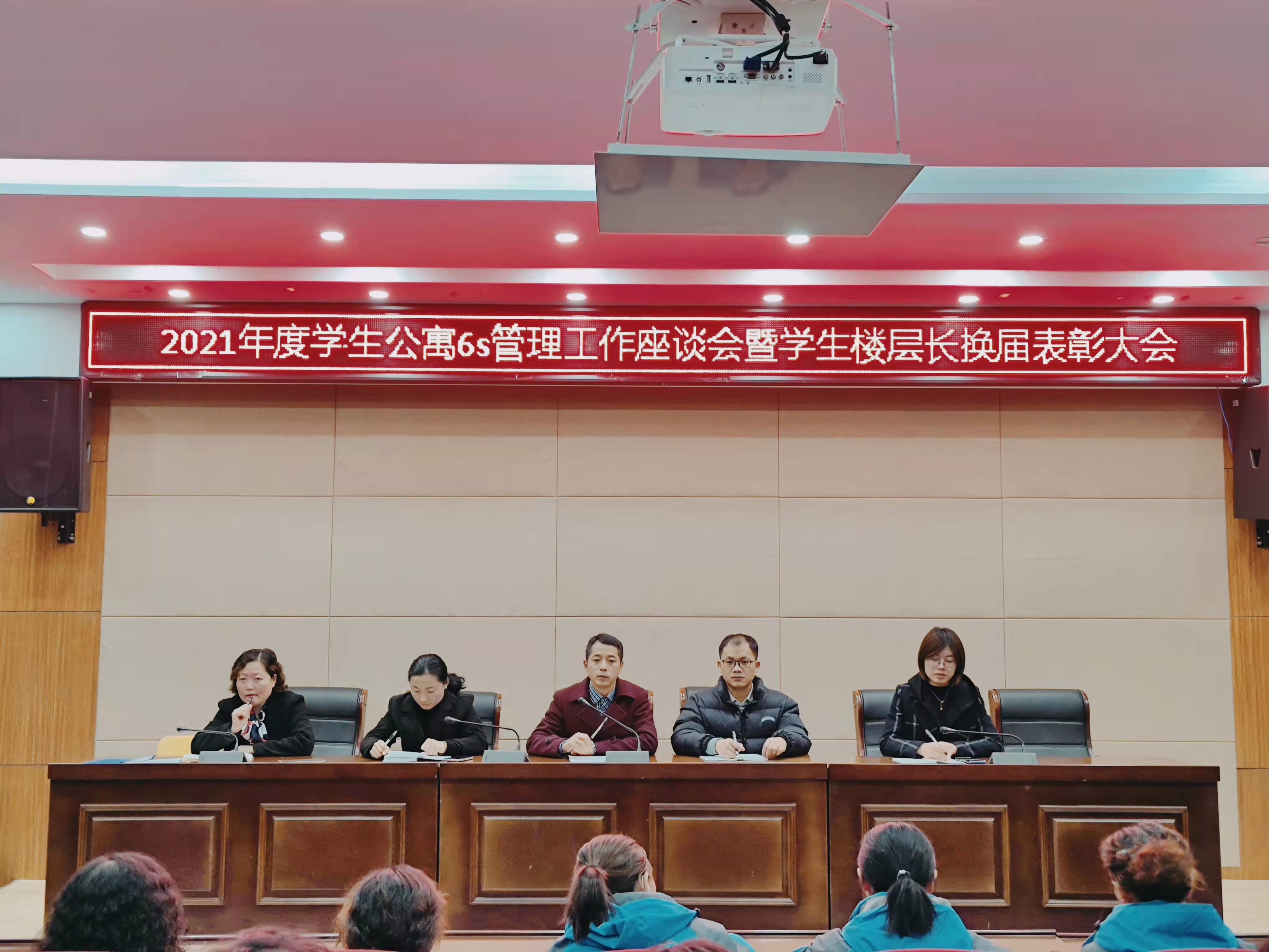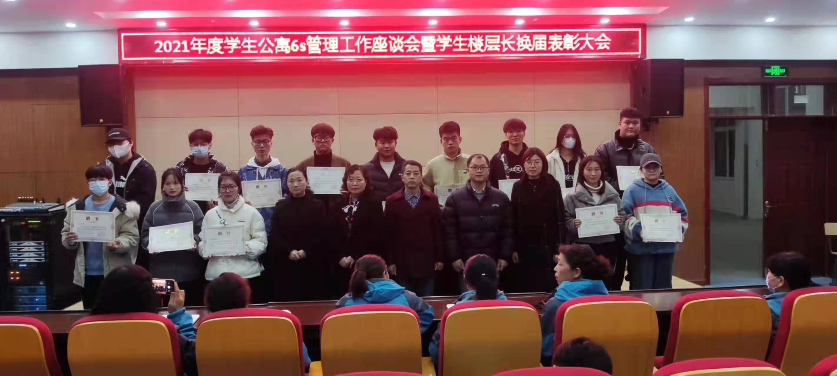 为进一步做好学生服务工作,加强与学生群体的交流和沟通,12月9日晚19时,后勤服务中心公寓管理科在南阶205教室召开2021年度学生公寓6s管理工作座谈会暨学生楼层长换届表彰大会。公寓管理科陆凤林科长,万顺物业项目经理梁发妹,公寓中心主任朱明春及相关人员和学生代表80余人参加了会议,会议由公寓中心主任朱明春主持。
