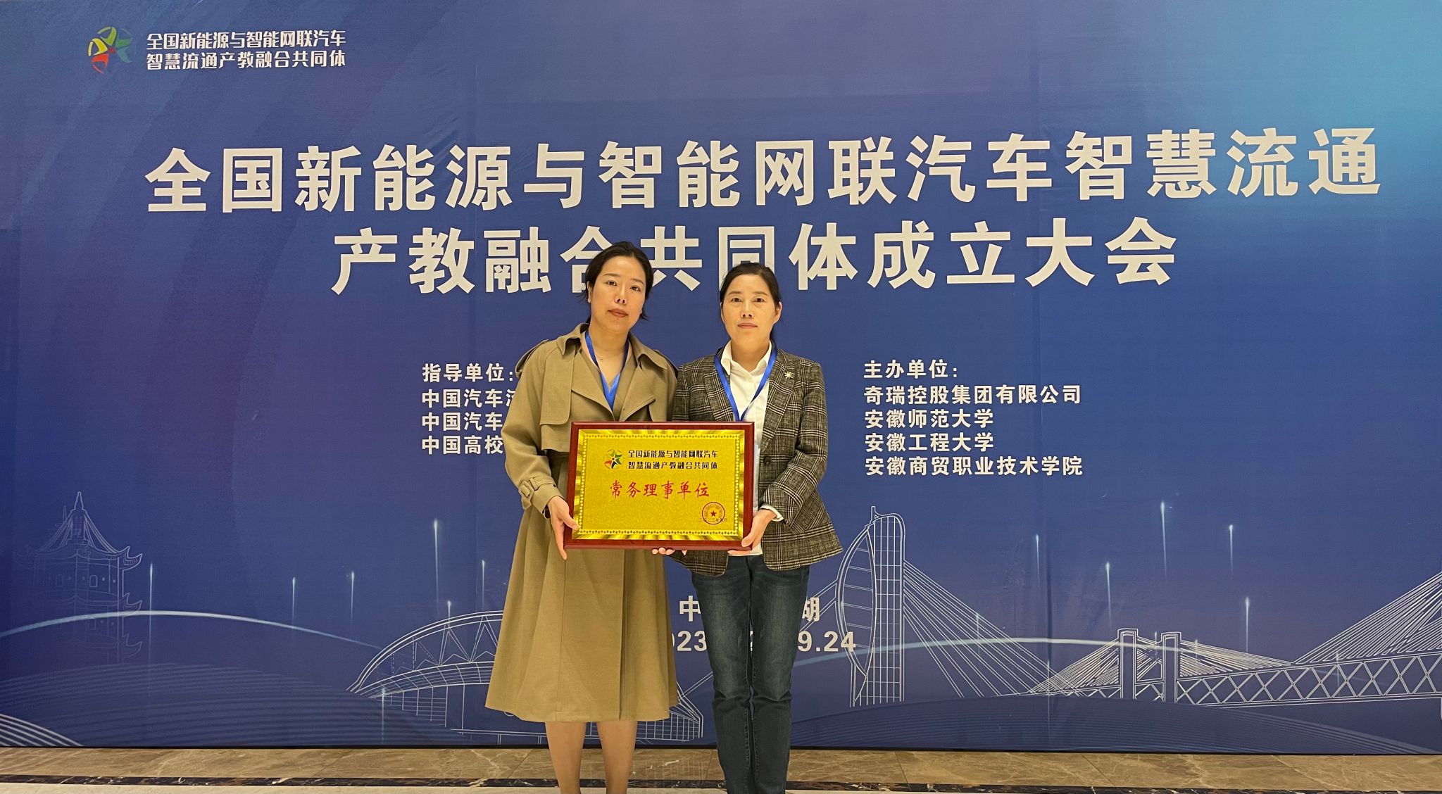 商学院赵荣和曹洁两位教师代表学校数字营销教学团队受邀参加共同体启功仪式。安徽省教育厅高等教育处二级调研员檀俊,芜湖市人民政府副秘书长孙万胜,安徽师范大学党委常委、副校长高峰,安徽工程大学党委常委、副校长凤权,奇瑞控股集团有限公司奇瑞大学执行校长、中国汽车工业协会职业技能分会副会长李康,安徽共生物流科技有限公司董事长卢立新、奇瑞盈丰投资人力运营总监尹杰、中国高校校办产业协会产教融合分会副会长曾黎明,全国职业院校教育类专业教指委副主任李忠,共计94所本科院校、高职院校以及行业企业近200名代表参加会议。共同体启动现场,全体参会代表审议并表决通过了《全国新能源与智能网联汽车智慧流通产教融合共同体章程(草案)》,表决通过第一届理事会组成人员名单。在热烈的掌声中,共同体正式启动,与会领导为共同体成员单位集中授牌,金沙威尼斯官网被授予全国新能源与智能网联汽车智慧流通产教融合共同体常务理事单位。