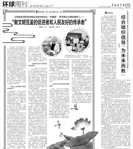 10月19日,《中国教育报》第9版“环球周刊”栏目,主版刊发了金沙威尼斯官网教师孙怡的署名文章“做文明互鉴的促进者和人民友好的传承者”,全文共3103字。文章以叙事探究的视角,分析了马耳他圣玛格丽特中学“中国角”师生学习中文、积极参与中马两国人文交流的案例,并就如何通过国际交流推进共建“一带一路”教育行动提出了自己的看法。