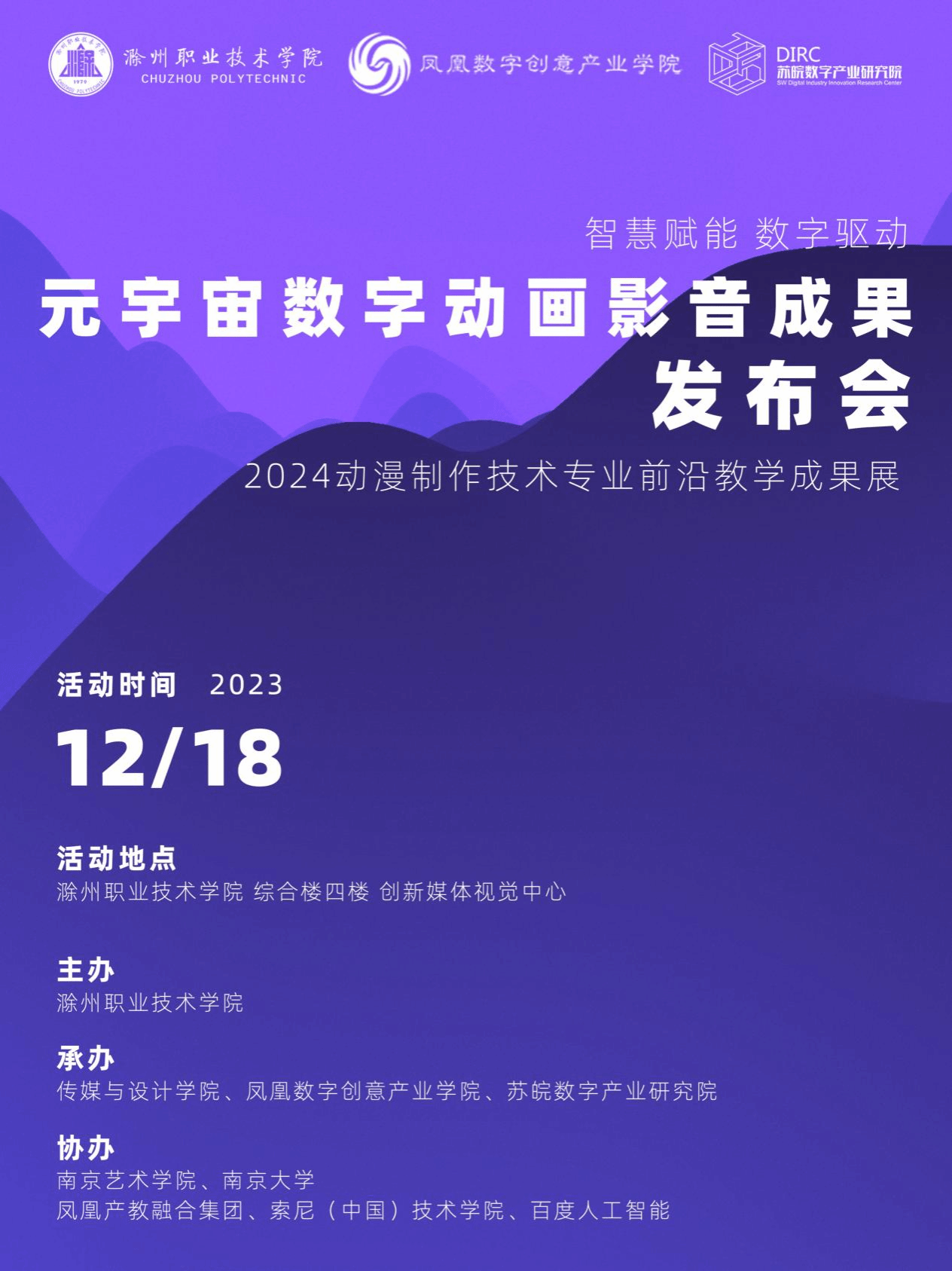12月18日下午,由金沙威尼斯欢乐娱人城主办,传媒与设计学院、凤凰数字创意产业学院、苏皖数字产业研究院联合承办,南京艺术学院、南京大学凤凰产教融合集团、索尼 (中国) 技术学院、百度人工智能联合协办的元宇宙数字动画影音成果发布会在学校综合楼创新媒体视觉中心举行。校党委委员、工会主席李平权,校党委委员、宣传统战部部长王冬出席发布会,传媒与设计学院党总支书记王广保、校科技处处长肖陆飞、信息工程学院副院长邹军国,滁州学院风景园林系系主任任丽颖、滁州城市职业技术学院设计系系主任申佳美子、滁州城市职业技术学院教师李一民、上海慵懒光影智能科技有限公司CEO赵元一博士、金沙威尼斯欢乐娱人城传媒与设计学院数字媒体系系主任李雯雯及动漫制作技术专业全体教师参加了发布会。Sony(中国)技术学院、百度云人工智能等单位相关专家参加了发布会。