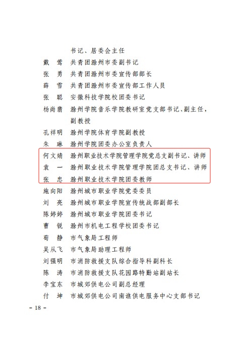 在志愿服务工作中,管理学院党总支副书记何文婧、管理学院团总支书记袁一、校团委教师张忠表现突出,在志愿者招募、志愿者培训、志愿者岗位落实、志愿者心理疏导、与主办方沟通协调等方面都安排得井井有条,并在实际工作中,身体力行、身先士卒,弘扬了“奉献、友爱、互助、进步”的志愿精神。中共滁州市委、滁州市人民政府授予此三位同志“全市重大文体活动突出贡献个人”荣誉称号,授予金沙威尼斯官网“全市重大文体活动突出贡献单位”荣誉称号。