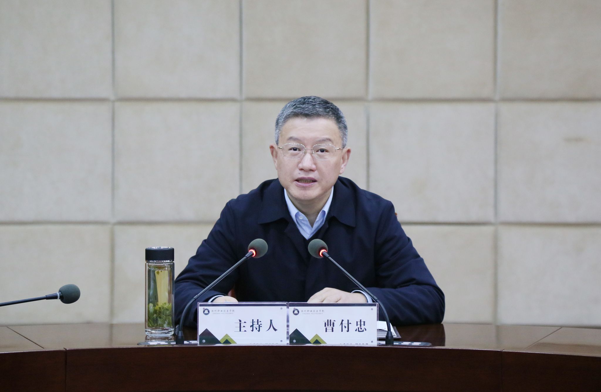 3月28日上午,学校在综合楼1102会议室召开党委理论学习中心组(扩大)学习会议,校党委书记曹付忠主持会议并讲话。校党委副书记、校长许雪峰,校党委副书记杨家庆,校领导江洁、孙静、苏有良、李平权、李超、王冬、王宇、穆松,各教学院部、各部门主要负责同志和列席中心组学习会议的有关负责同志出席会议。