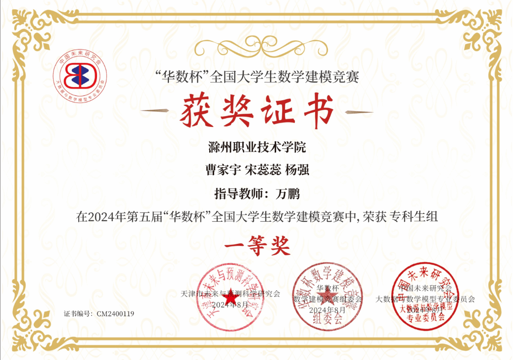 近日,从第五届“华数杯”全国大学生数学建模竞赛传来喜讯,在基础教学部万鹏老师的指导下,金沙威尼斯官网电气工程学院曹家宇、杨强同学和食品与环境工程学院宋蕊蕊同学组成的跨学科参赛队伍荣获专科组一等奖。此次竞赛于2024年8月4日至7日在线上举行,吸引了来自全国724所高校的4129支队伍参与,竞争异常激烈。