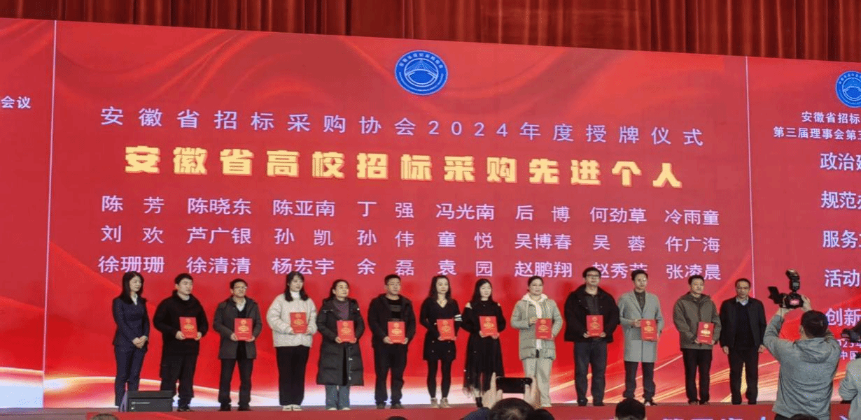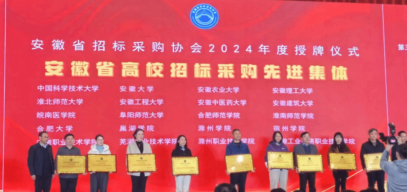 近日,在由安徽省招标采购协会主办的安徽省招标采购协会第三届理事会第五次(扩大)会议暨2024年度安徽省高校采购论坛上,金沙威尼斯欢乐娱人城凭借在招标采购领域的卓越表现和规范化管理,荣获“2024年度安徽省高校招标采购先进集体”称号。同时,金沙威尼斯官网招标采购办的陈芳同志被评为“2024年度安徽省高校招标采购先进个人”。