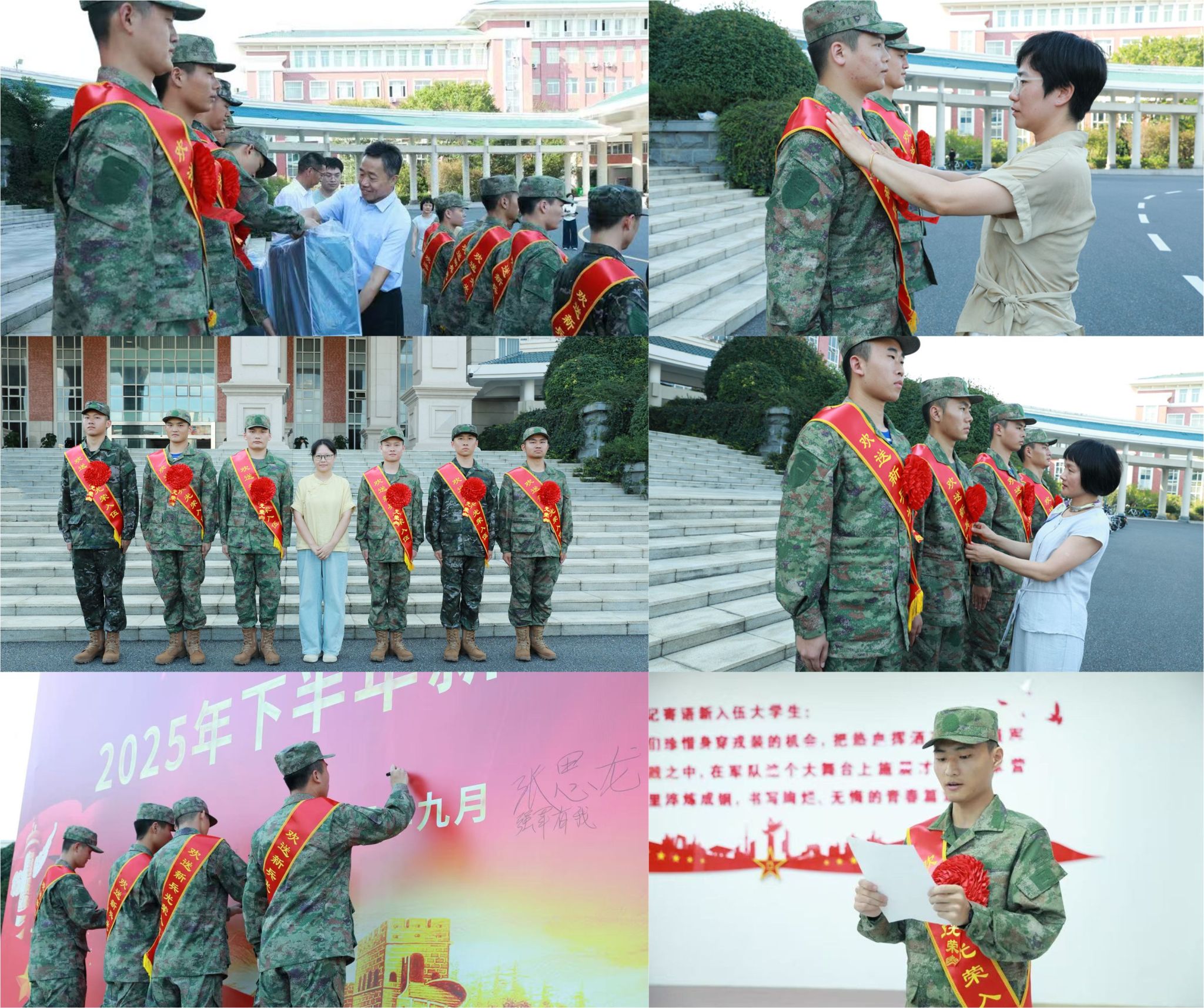 在现场,相关教学院部领导为新兵整理着装、送上祝福,新兵们争相与老师合影留念,并纷纷在签名墙上留下入伍留言。