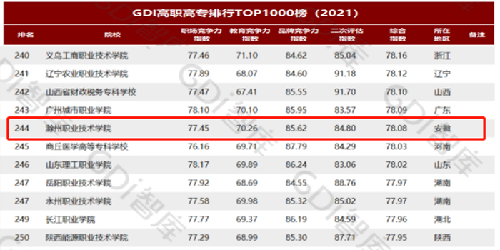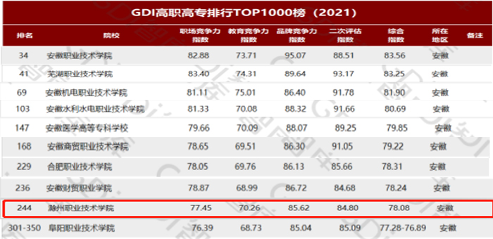 4月21日,广州日报数据和数字化研究院(GDI智库)发布“GDI高职高专排行TOP1000榜(2021)”,以职场竞争力指数、教育竞争力指数、品牌竞争力指数和二次评估指数四个一级指标建构综合指数。评价院校涵盖国内1451所高职高专,金沙威尼斯官网以综合指数78.08排在全国第244位,位列安徽省74所同类高职院校第9位。